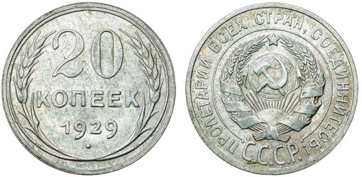 Цена на монету 20 копеек 1929 года = 2 - 3 $.
